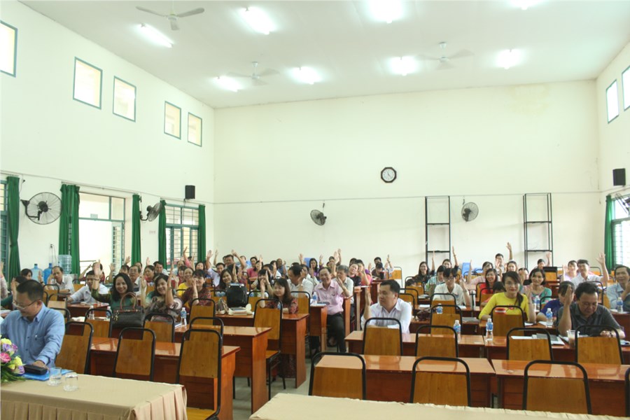 Giáo viên, nhân viên nhà trường biểu quyết thông qua dự thảo Nghị quyết Hội nghị